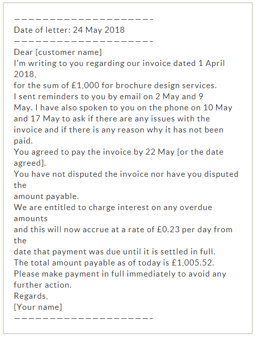 After 14 days:Send a solicitor’s warning letter OR another formal letter directly from yourself that includes: