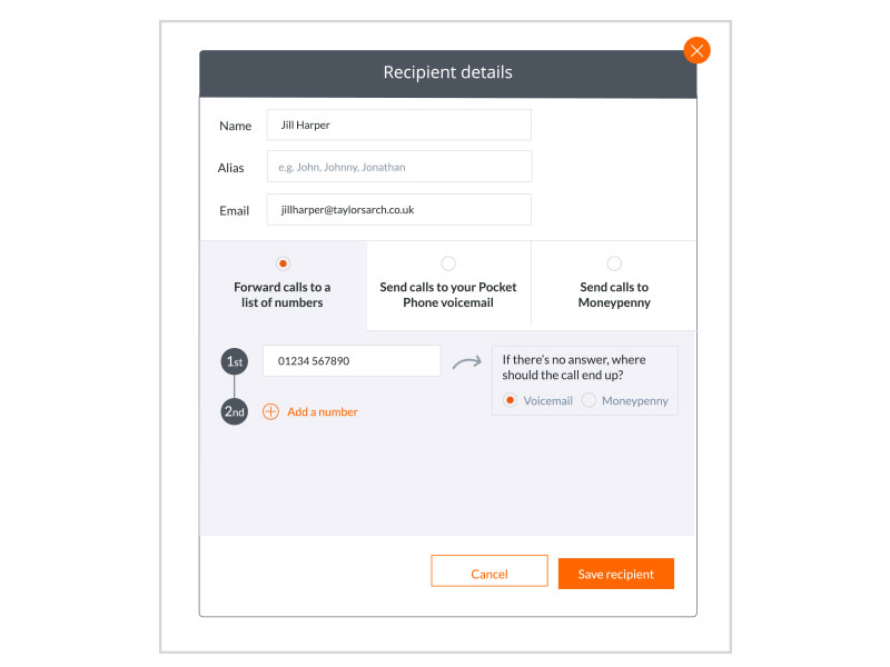 2. Input up to three number for each recipient to receive calls on. Your Pocket Phone System will try all of the number either in order or at random, or you can send straight to voicemail or a Moneypenny PA.
