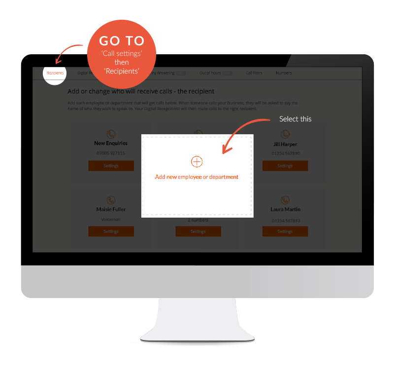 First things first, Recipients are people or departments. To set-up your recipients, you’ll need to go to ‘Call settings’ and then ‘Recipients’ where you’ll find the option to add a new employee or department. Select this and follow the below instructions: